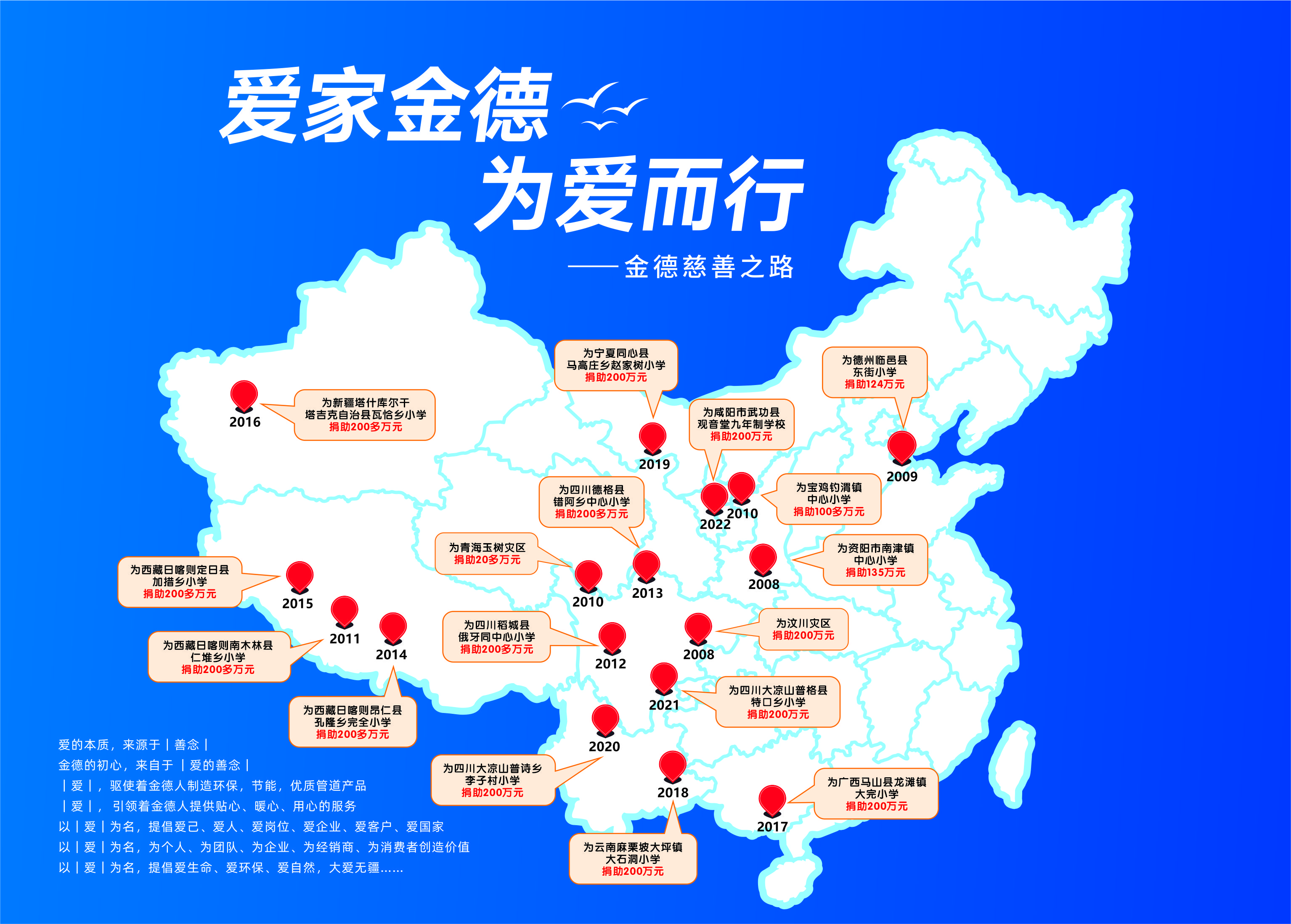 為了銘記汶川地震,也為了幫助更多貧困地區的孩子們得到更好的教育,金德管業集團把每年的五月份定為企業的慈善月。每年五月,金德管業集團全體員工和廣大經銷商朋友都會慷慨解囊,捐助一所希望小學,期間金德人做慈善的腳步從未中斷過。